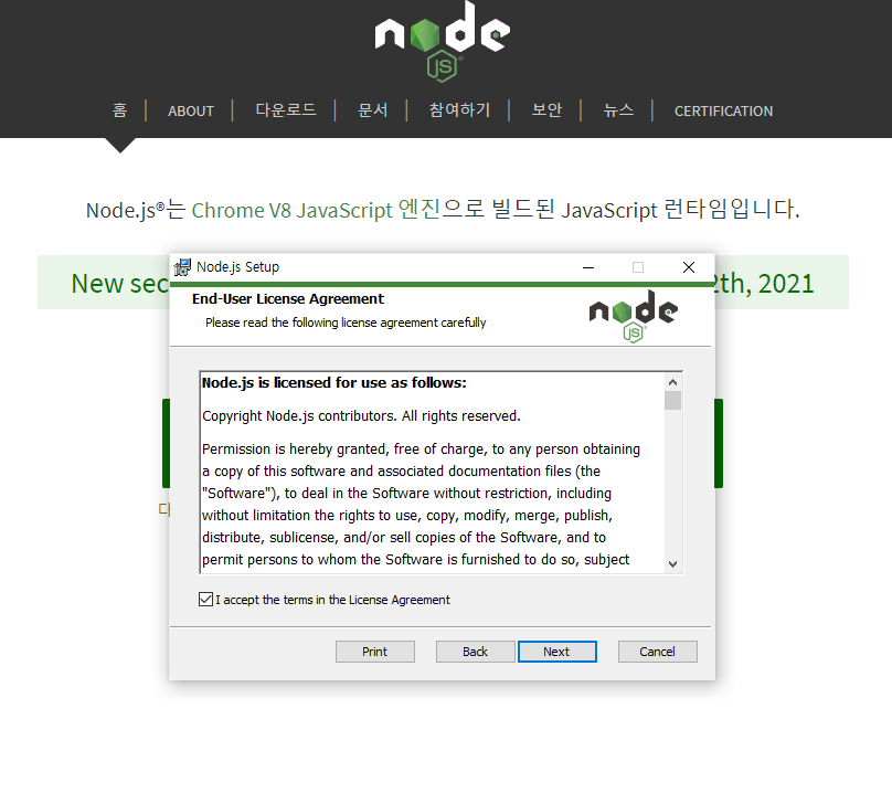 다운로드한 파일을 실행해 node js 설치를 진행합니다.